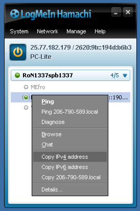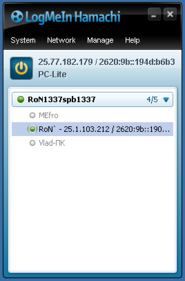 Now then Power button is pressed, you can see the IP that you will have in virtual network (in my case it's 25.77.182.179). Also there is your computer name (mine is PC-Lite).