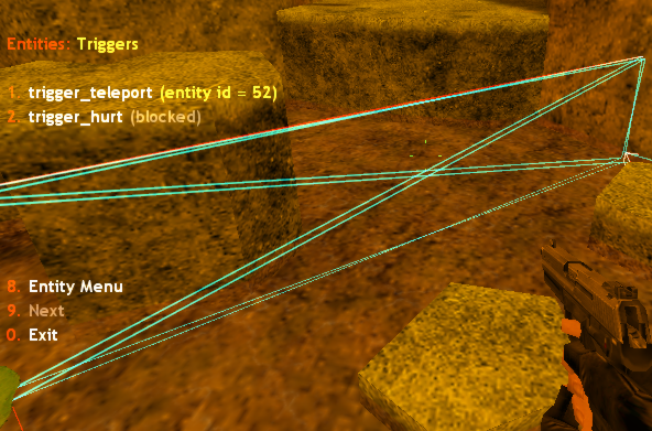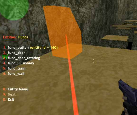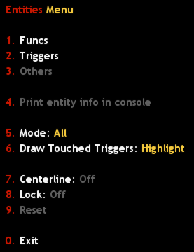 In this mode you can highlight only one entity at a time. To choose the entity you need to look right at it and click attack button (with knife or any weapon) or by using enumeration in the first three items of menu. Enumeration is handy when you don't know where entity is placed. For example, we want to find all func_button on the map. We set 7. Centerline to On (to draw the line to the center of button), open 1. Funcs and start to pressing item named func_button. In so doing all buttons on the map will highlighted one by one, and you can find every one of them by moving along the Centerline. If you need to get info about chosen object, use 4. Print entity info in console or chat command /entinfo (also /fullentinfo for printing all entity properties). If no entities were chosen , chat command shows worldspawn properties.