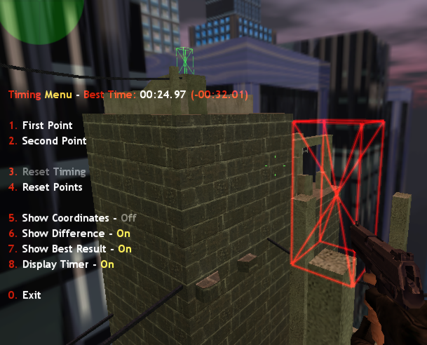 If you press the first menu item, a green area sized as a standing player's model will be created around you. As soon as the center of your model enters this area, a special timer is started. In a similar way the second menu item creates red area, which stops the timer.