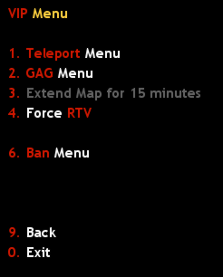 From here you can mute (Gag Menu), ban (Ban Menu) and teleport (Teleport Menu) to the certain player. By the way, if you want to teleport another player to you, just use standard AXMM console command
