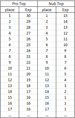 Let’s consider particular numbers. Every place in Nub and Pro Tops on the server corresponds to specific amount of Exp, which are given to player: