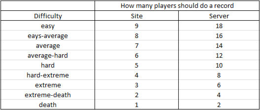The lower map’s difficulty is (specified in map’s profile), the more records are needed for it to become rating map. To be precise, the number of records is not counted, but the number of players who finished the map (i. e. records of one player in Pro and Nub Tops are counted as one). At the moment we use the following thresholds: