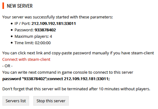 Click corresponding button to run your own server and it will be started with random port and password. Also you will be able to use amx_map console command to change map (if it fails for some reason, try to use chat command /map, for example /map bkz_goldbhop). If server started successfully you will see this page: