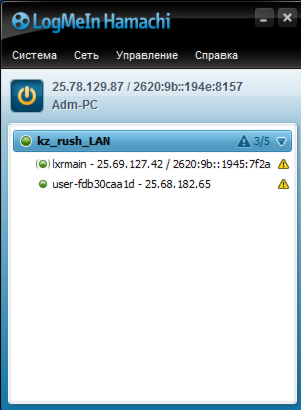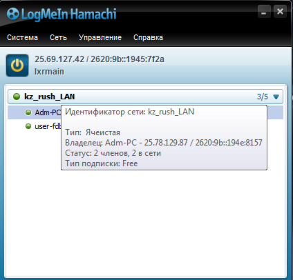 Пусть теперь подключившийся к сети lxrmain хочет попасть ко мне на сервер в CS. У себя в Hamachi он наводит мышь на название сети и видит, кто является её владельцем: