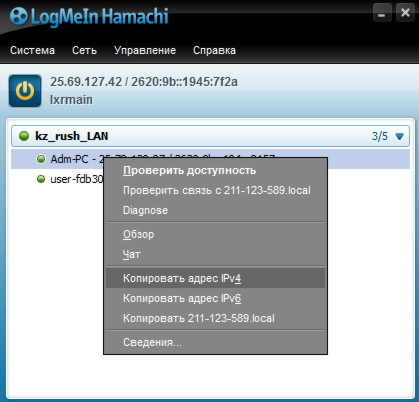 Затем он кликает правой кнопкой мыши по владельцу и выбирает Копировать адрес IPv4 (тот самый 25.78.129.87, что был мне присвоен):