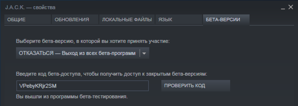 На вкладке Бета-версии необходимо ввести код VPebyKRjr2SM в соответствующее поле и нажать «Проверить код»: